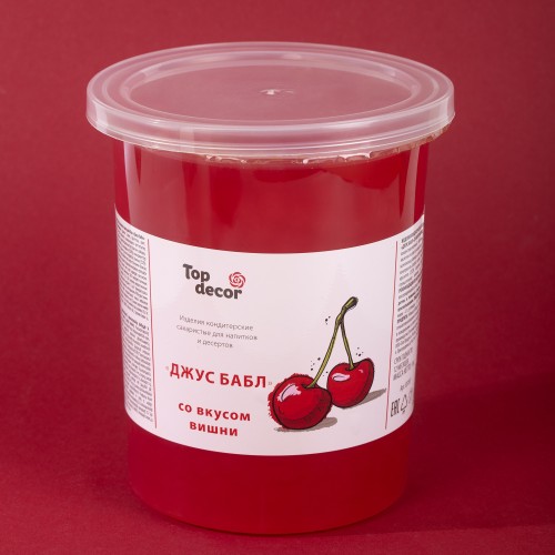 Состав продукта: Патока, фруктоза, сахар, сок концентрированный яблочный, крахмал кукурузный, регуляторы кислотности (лактат кальция, кислота лимонная), стабилизаторы (камедь ксантановая, камедь целлюлозы, альгинат натрия), уплотнитель (Е509), консерванты (сорбат калия, бензоат натрия), ароматизатор натуральный «вишня», краситель (Е110).