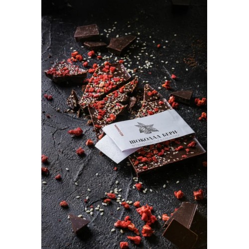 Состав: какао тертое, какао масло, сухое обезжиренное молоко, кунжут, клубника сублимированная, соевый лецитин, смесь подсластителей (стевия, эритрит, сукралоза), ароматизатор
